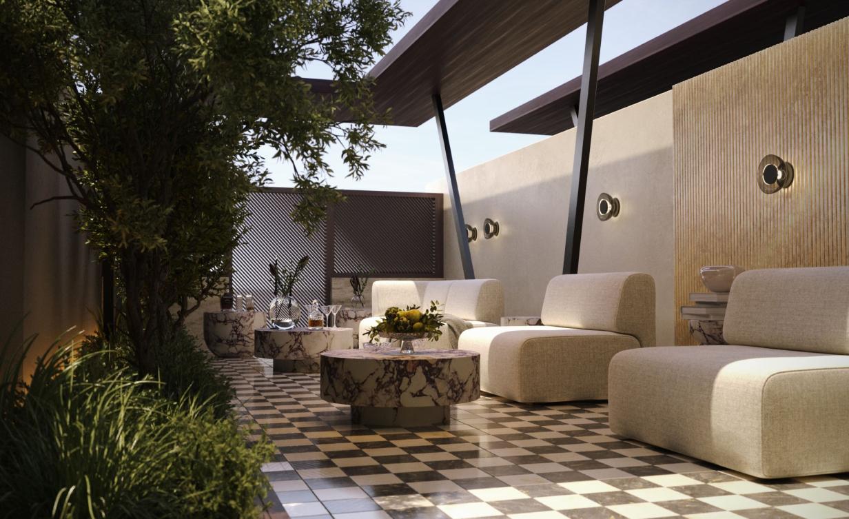 منطقة جلوس مطلة على نافورة خارجية